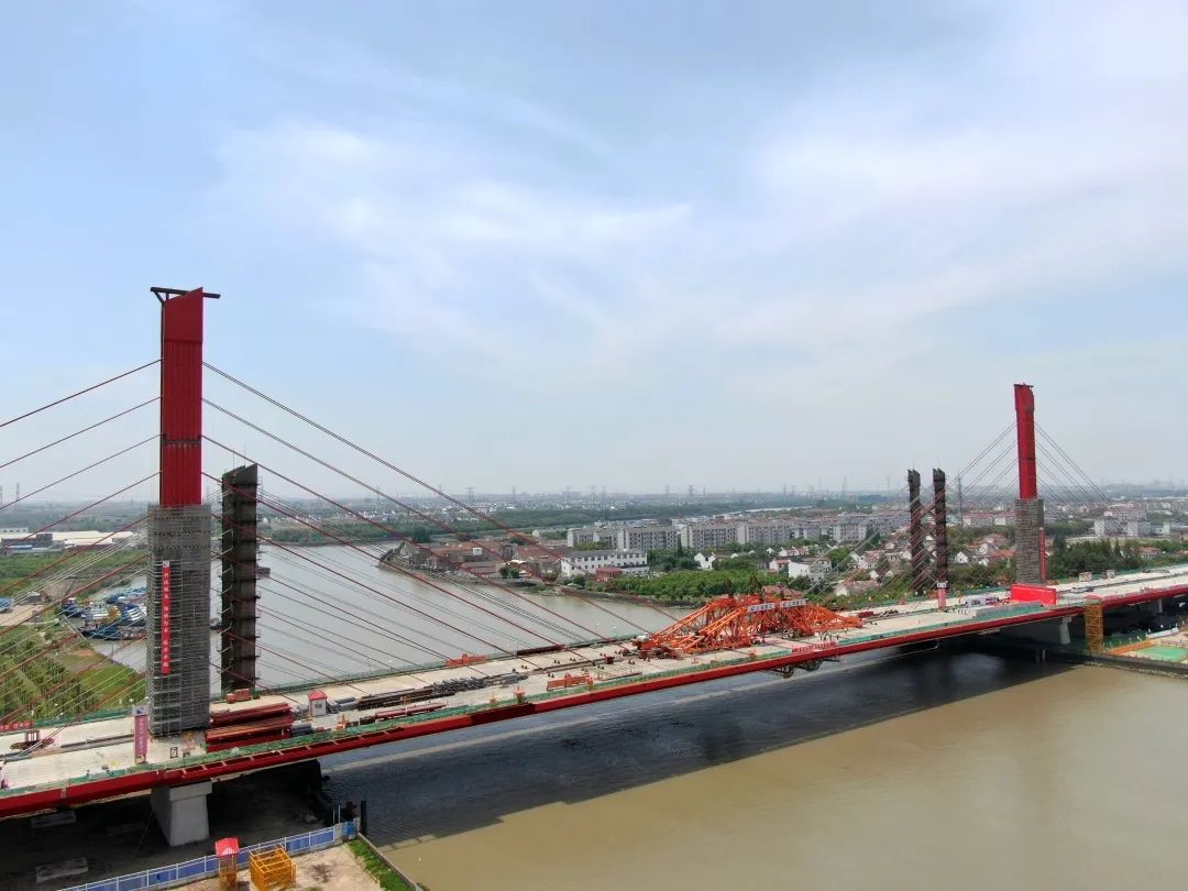 葉新公路泖港大橋工程位于上海市松江區(qū)泖港鎮(zhèn),線路為東西走向,新建泖港大橋于2018年4月動工興建,主橋一跨過河、采用鋼塔鋼箱梁平行單索面斜拉橋,塔梁固接、塔墩分離體系,主橋跨徑445米,其中主跨225米,主塔高60米,主跨寬38.5m,為一級公路,雙向6車道及人行道、非機動車道。此前,2020年5月20日,新建泖港大橋?qū)崿F(xiàn)主橋合龍。